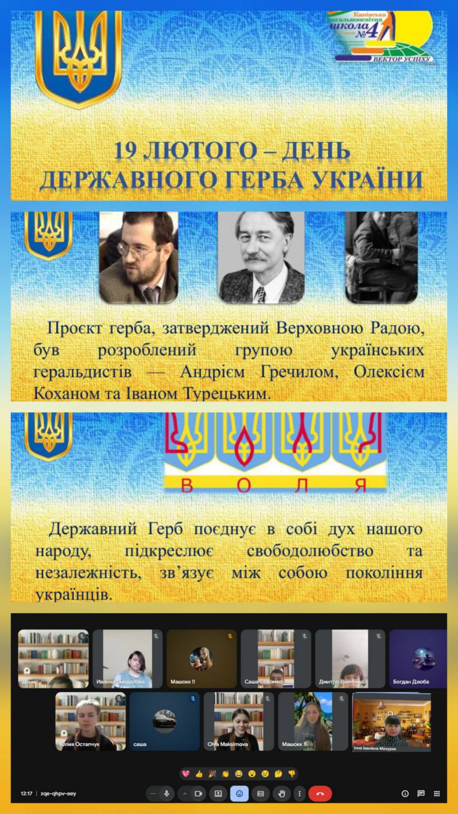 Учні взяли участь у пізнавальній вікторині, переглянули презентацію про історію державних символів України, обговорили, чому важливо шанувати та знати символи своєї країни. Особливу увагу було приділено тому, що Державний Герб разом із Прапором і Гімном є уособленням незалежності та суверенітету нашої держави.